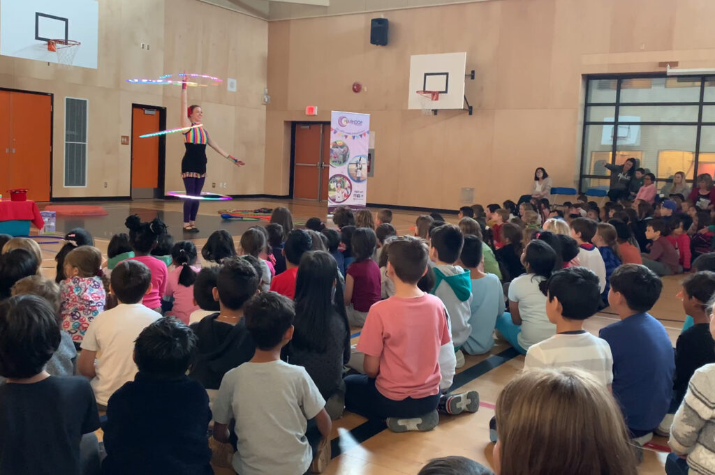 Students learn hula hooping plus additional circus skills such as juggling, poi spinning, and plate spinning